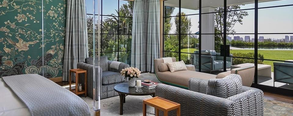 The primary bedroom suite is incredibly spacious with its own sitting area, double baths and walk-in closets. One of the 17 bathrooms has a vintage pastel pink and gold look with an old-fashioned gold bath. Known as ‘The Bellagio Estate’, this gem of a tasteful house is a showplace for art and high design.